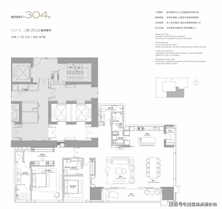 :300㎡起纯大平层 / 别墅,3.6-3.9 米奢阔层高,全玻璃幕墙地标外观,国际大师设计 + 顶奢精装,专梯专户、车位比 1:2.3,塔尖标配。