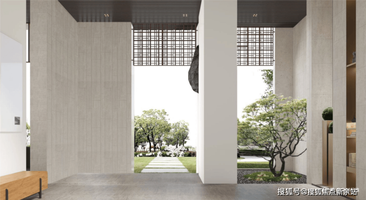 🔘威仪门庭:以东方雅韵为出发点,从尺度、比例、制式、材质等细节方面,将新中式建筑精髓与当代格调完美融汇于车库、大堂、社区大门之中,极致挑高尺度,尽显恢弘气度