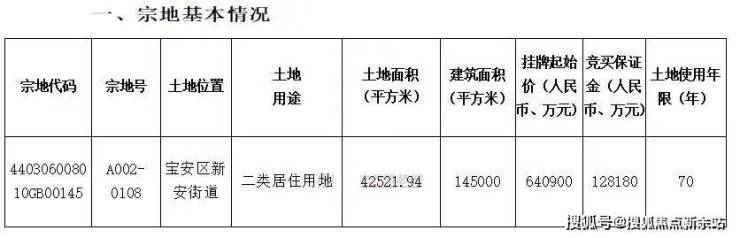 宗地总面积42521.94平方米,其中,规定建筑面积145000平方米,挂牌起始价64.09亿,竞买保证金约12.8亿,土地使用年限为70年。