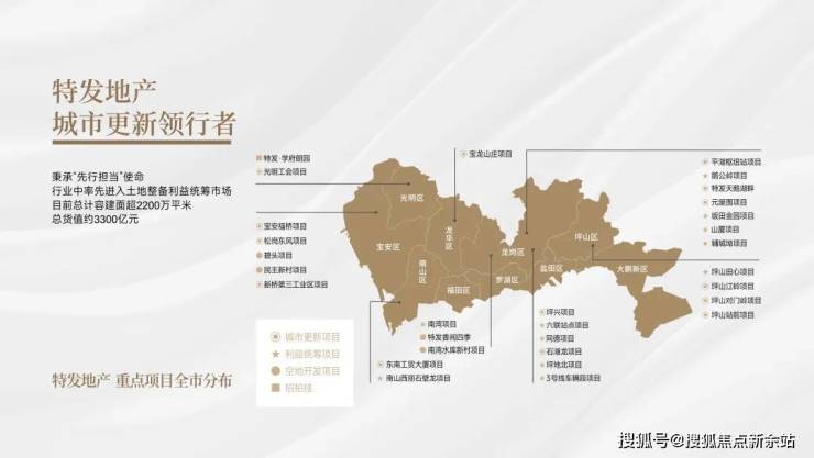 特发地产,成立于1997年7月,是特发集团下属全资国有企业,紧扣“双区驱动”国家战略,深耕深圳、大湾区及长三角等区域,以住宅开发为主,发展成为卓越的城市更新综合开发运营商。在深圳市属国企中率先大举介入城市更新领域,在全行业中较早进入土地整备利益统筹市场,不断创新商业模式,携手众多优秀合作伙伴,锁定大量优质项目,截止2023年5月,共储备各类型项目29个,总计容建筑面积约2200万平方米,总货值约3300亿元,处于行业前沿。