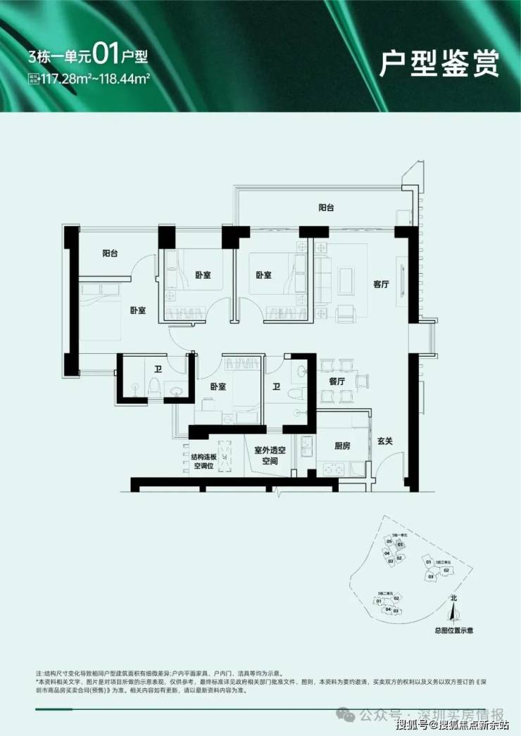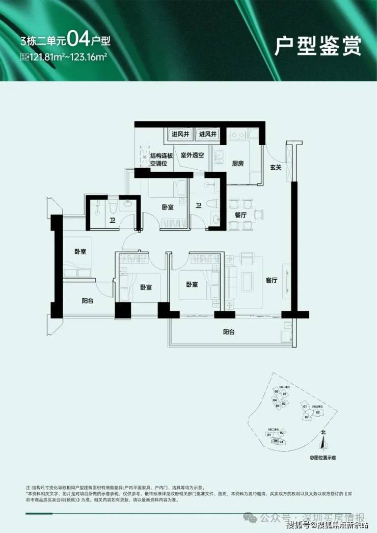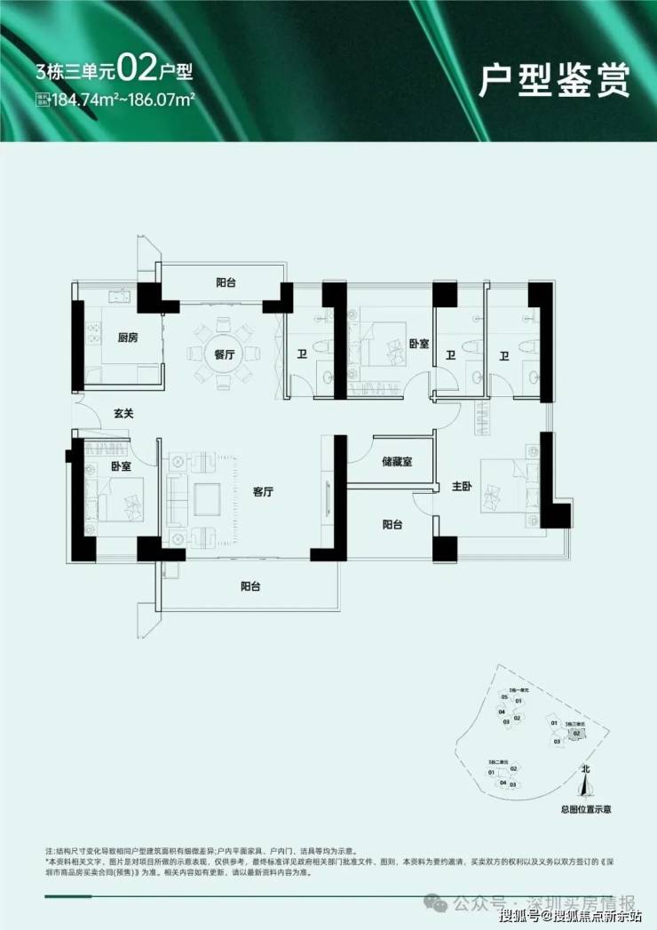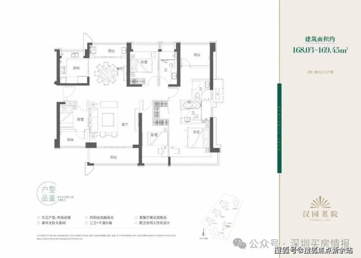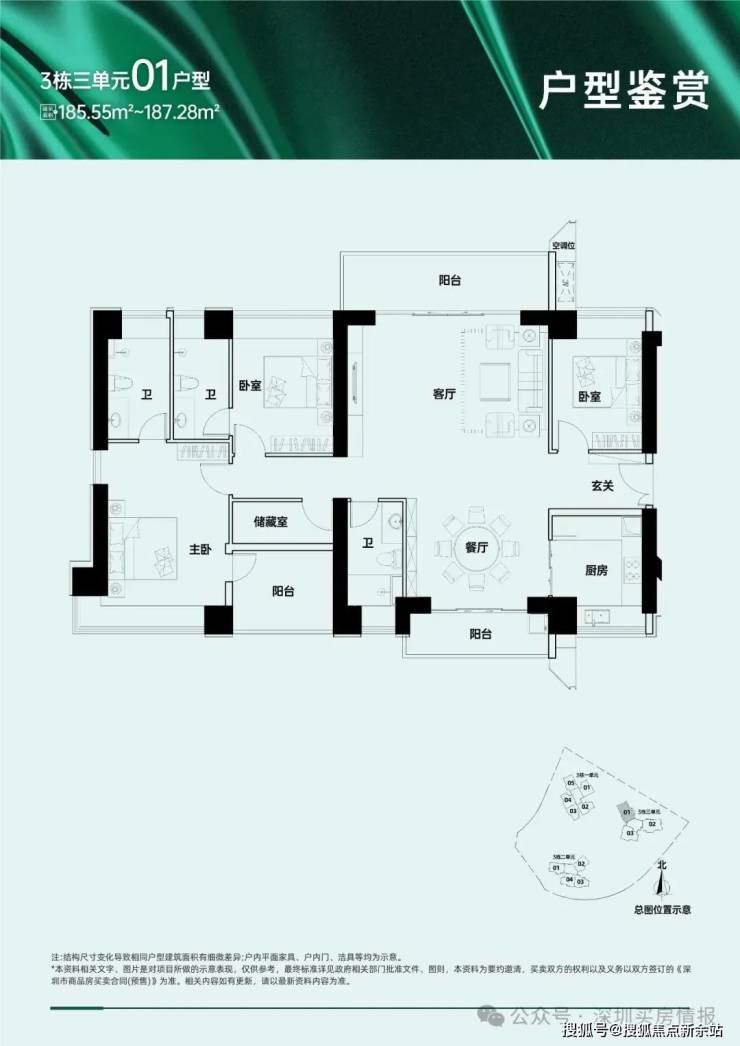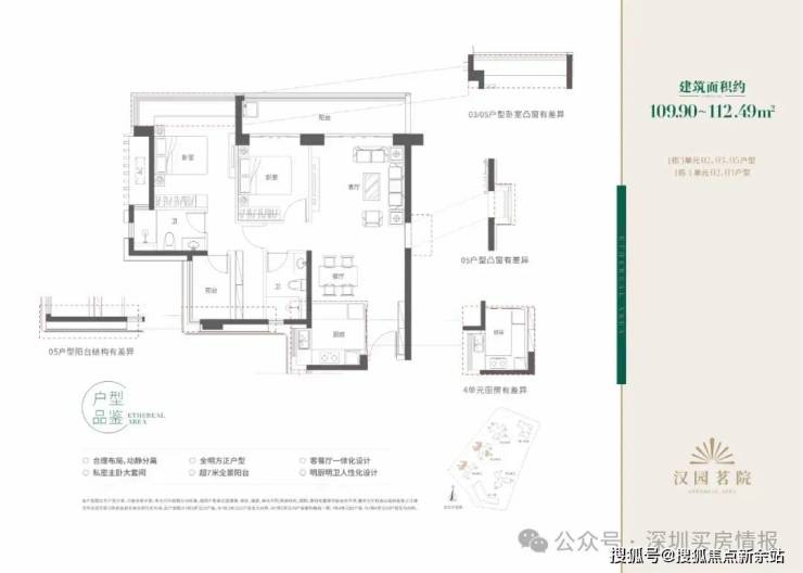 A区主要由5栋住宅组成,二、三、四单元45层,一、五单元46层,其中一单元为保障房,不与其他商品房混在一栋楼里,朝向大都是西南/东南向,少数腿正南向,三单元15楼以上及四、五单元为本次推售楼栋,面积109~169㎡的三-四房,另有12套顶楼复式。