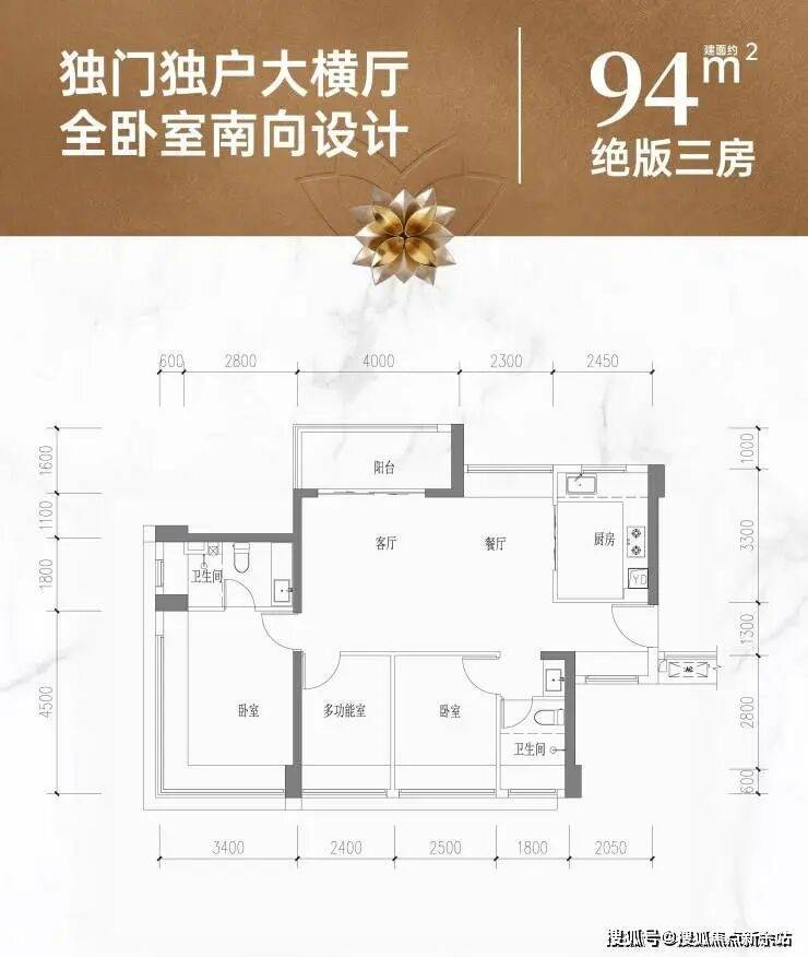 94㎡的3房2厅2卫:折后总价418-437万/套 。独门独户设计,大横厅布局,客餐厅开间达到5.9米,加上赠送后得房率惊人地达到了95.54% 。