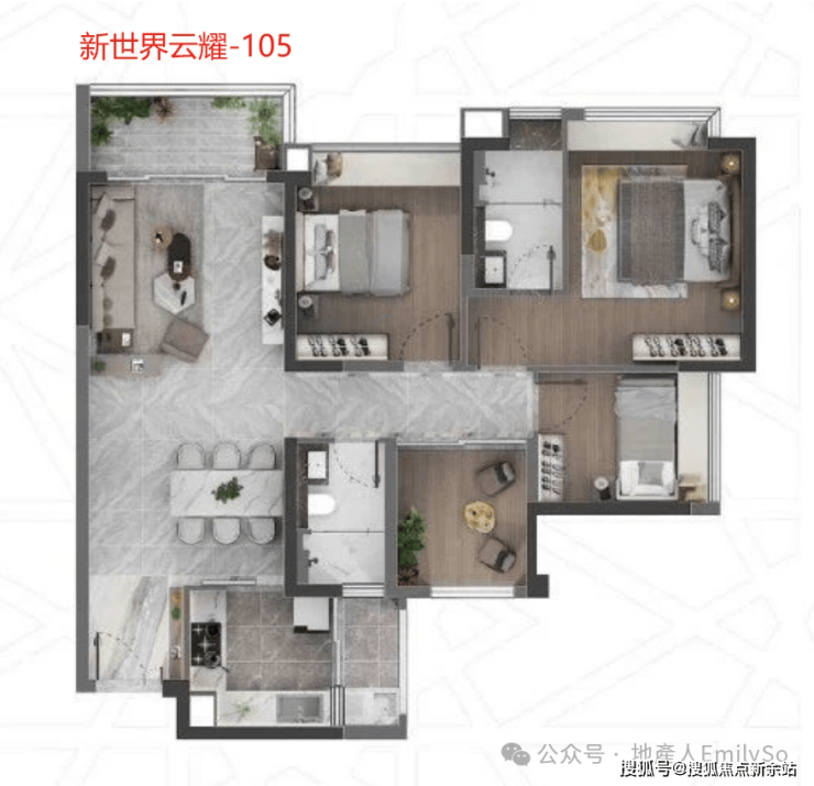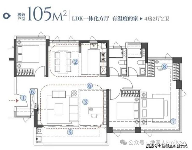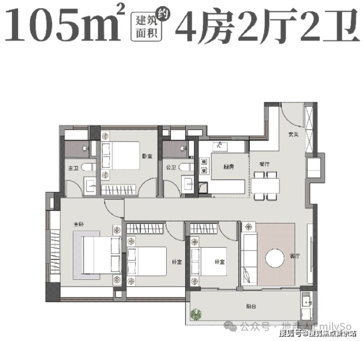105㎡:南北对流,4-4.5开间朝南,餐厅带大面屏飘窗。