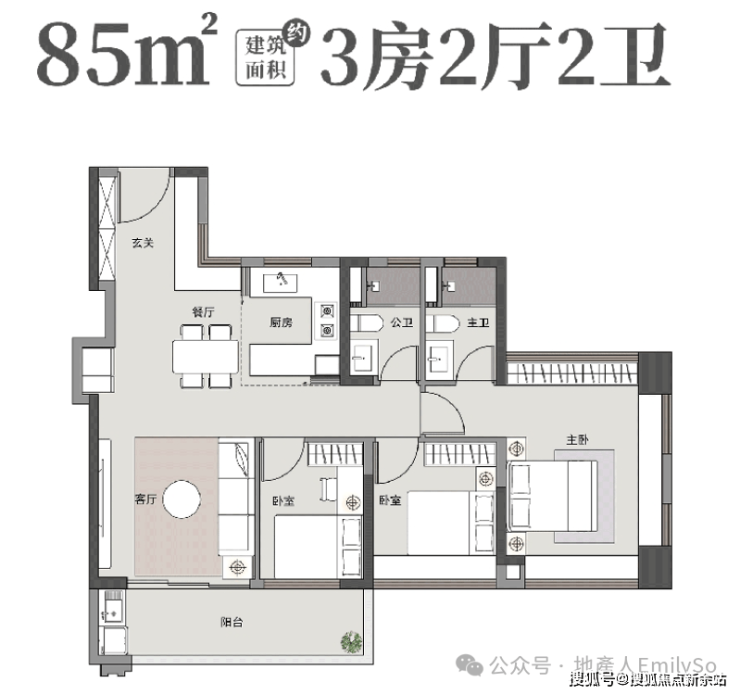 88㎡:四空间,四开间朝南,主卧270°飘窗