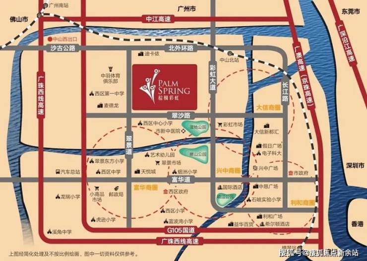 周邊翠景道、北外環、105國道、彩虹大道、廣珠西線高速等形成的立體交通網絡,快速通達全城,並可快速抵達廣州、深圳、珠海等珠三角核心城市。
