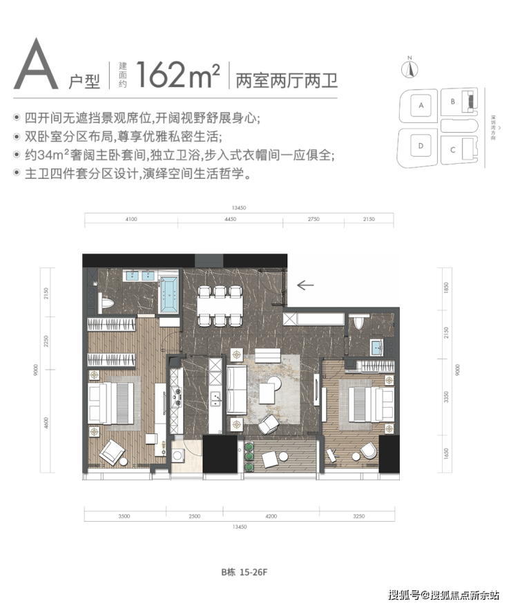 约164㎡2房2厅2卫(独立入户玄关,动静分离,约33㎡豪华主卧,承载品质生活)