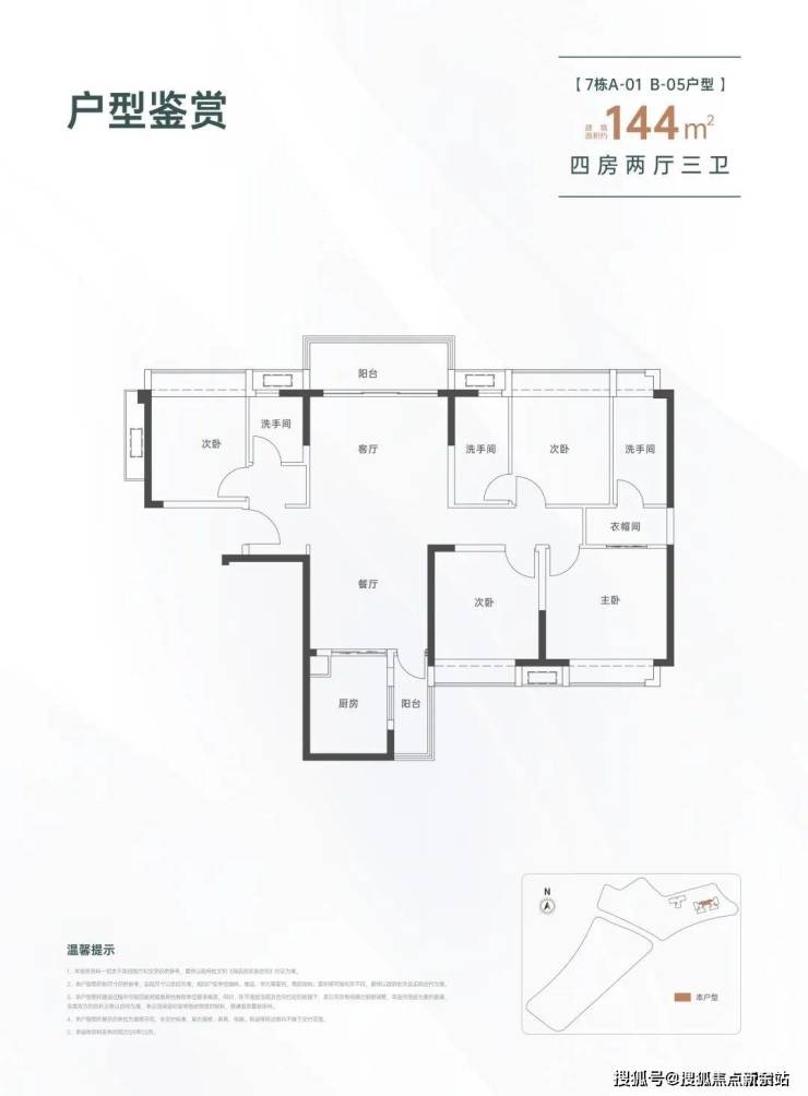 144㎡的4房2厅3卫,设计的是竖厅南北通透格局,进门入户玄关,LDKB一体化设计,双主卧套房,L型厨房还带1个生活阳台,公卫干湿分离,得房率约82%(不含赠送),阳台主朝西北向。