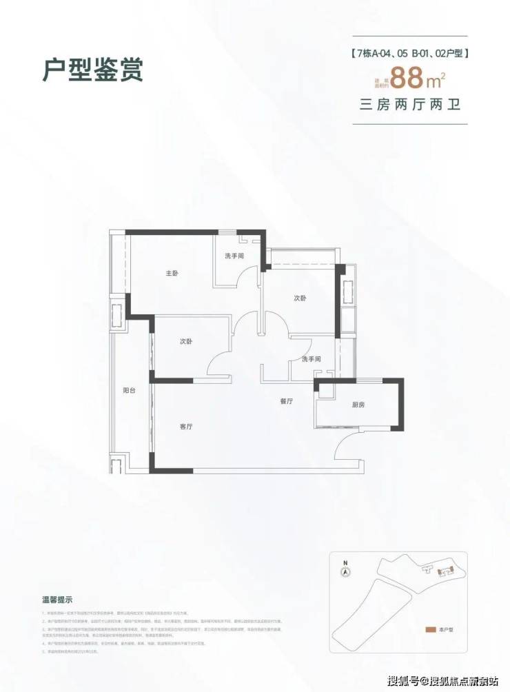 88㎡的3房2厅2卫,设计的是经典竖厅格局,进门入户玄关,LDKB一体化设计,动静分区,客厅连接次卧出大阳台,L型厨房,公卫三段式分离,得房率约82%(不含赠送),西南或东北朝向。