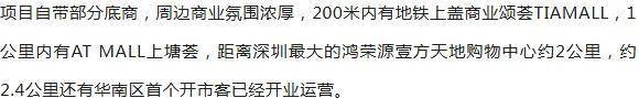 距离深圳最大的商场龙华壹方天地购物中心约2公里,距离天虹购物中心约2.6公里,可满足购物休闲娱乐需要。