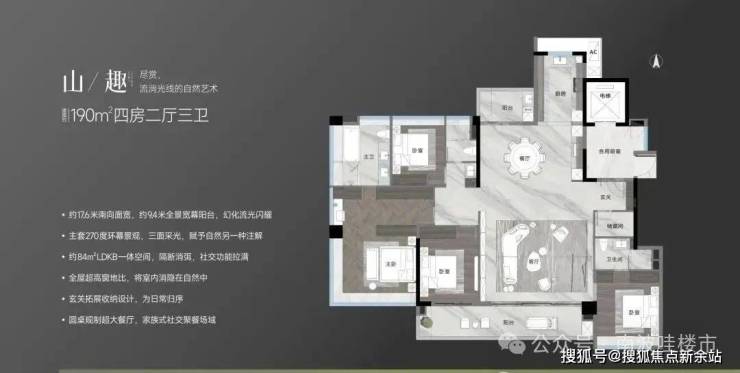 「山趣」建面约 190㎡匠心臻品,以极致尺度与视野,将自然盛景融入生活日常。约 17 米南向恢弘面宽,搭配全屋超高窗地比设计,让阳光与清风肆意流淌;全南向功能空间布局,营造通透敞亮的居住体验。
