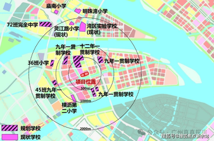 地块周边约2千米范围内有横沥第二小学、湾区实验学校(九年一贯制学校)、灵江路小学、明珠湾小学,周边1千米范围内有2所九年一贯制学校(规划)、1所十二年一贯制学校(规划)、1所45班九年一贯制学校(在建)等多所学校。