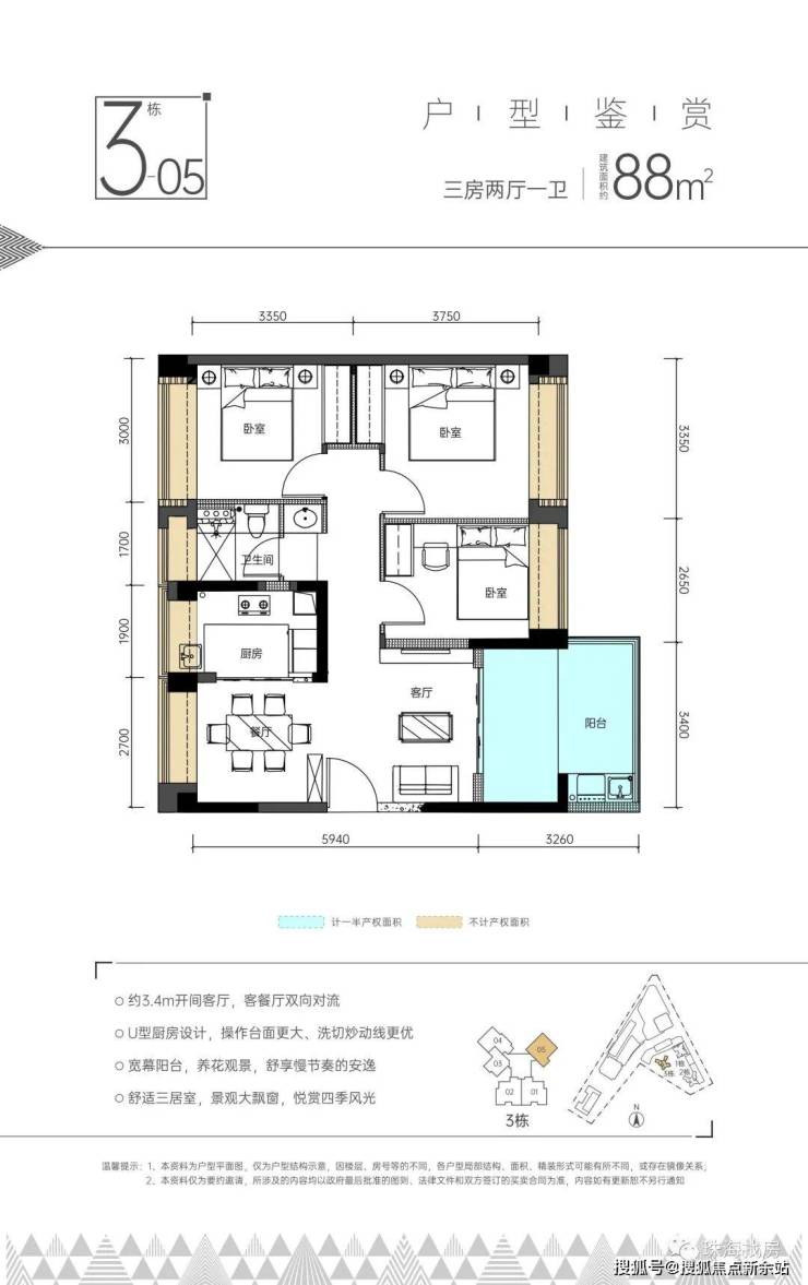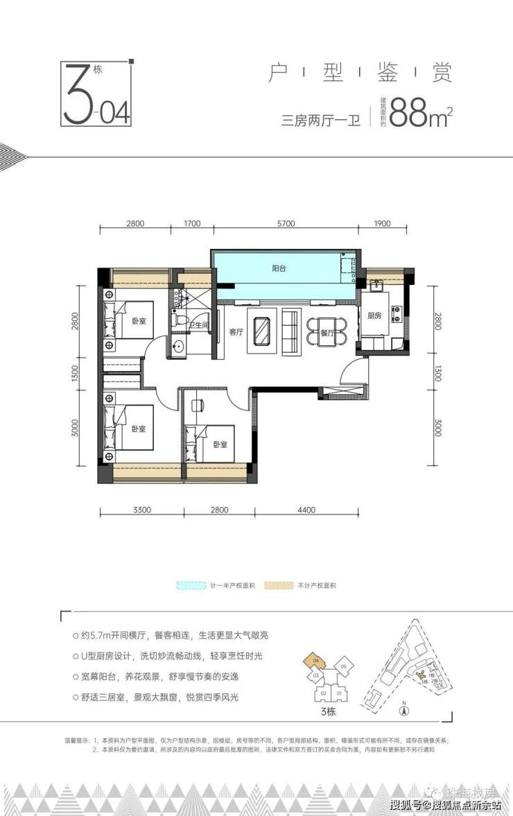 三房两厅一卫:88㎡