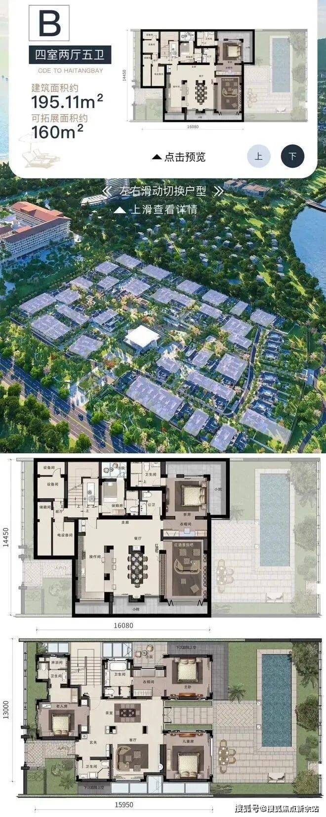 B户型:四室两厅五卫,建面约:195.11㎡ ,可拓展面积约:160㎡,占地面积约 332-998 ㎡