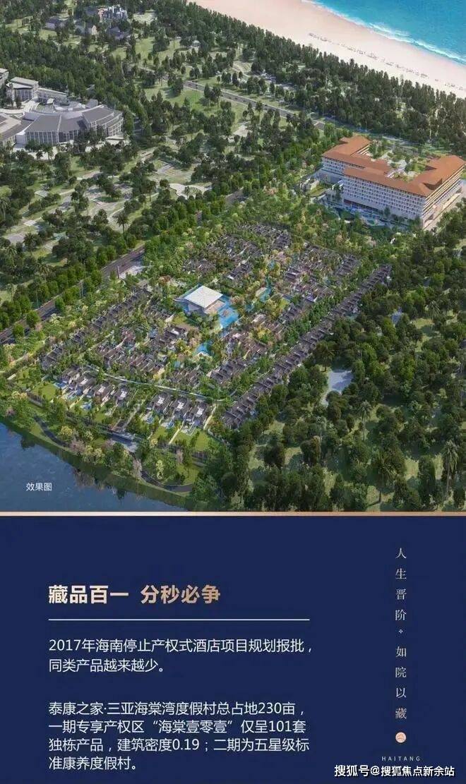 是泰康倾心打造的继泰康之家 CCRC 持续照护养老社区后的创新产品线,选址自然环境与未来发展俱佳的海棠湾一线,旨在满足全年龄段客户休闲度假、候鸟旅居、适老化等多元需求。分两期开:一期为专享产权区海棠壹零壹(101席中式独栋产品,建面约2万㎡,在售),二期为五星级标准康养度假村(建面约8万㎡,按五星级酒店标准投建)。