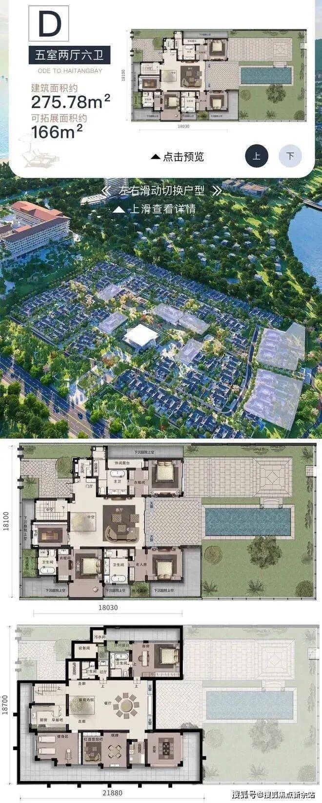 D户型:五室两厅六卫,建面约:275.78㎡,可拓展面积约:166㎡,占地面积约557-1366 ㎡