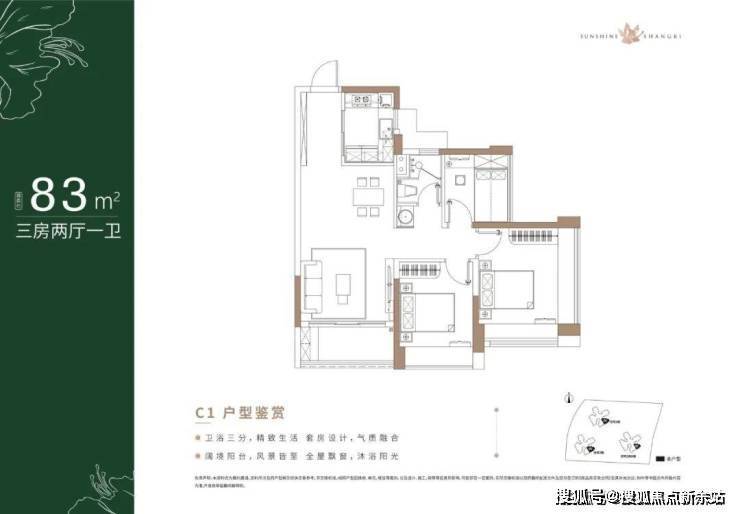 83㎡的3房2厅1卫,设计的是经典竖厅格局,客厅实测3.26米开间,LDKB一体化设计,进门入户玄关,三开间朝南,3个卧室分别做到主卧14.05m²/次卧9.25m²/次卧5.3m²(实测面积),主卧270°转角飘窗,U型厨房,卫生间三段式分离,得房率:76.44%(不含赠送),西南或东南朝向。