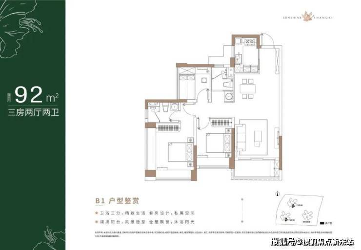 92㎡的3房2厅2卫,设计的是经典竖厅格局,客厅实测3.25米开间,LDKB一体化设计,三开间朝南,3个卧室分别做到主卧15.32m²/次卧9.15m²/次卧5.57m²(实测面积),主卧270°转角飘窗,L型厨房,公卫三段式分离,得房率:76.44%(不含赠送),西南或东南朝向。