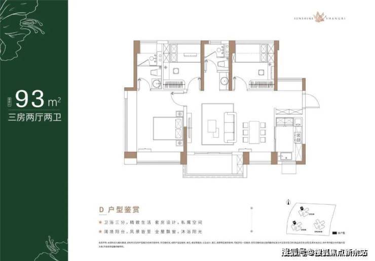 93㎡的3房2厅2卫,1/3栋的02户型,设计的是横厅南北通透格局,客餐厅5.8米开间,LDK一体化设计,3个卧室分别做到了3.2米/2.9米/2.5米的宽度,主卧270°转角飘窗,U型厨房,公卫三段式分离,得房率:76.44%(不含赠送),阳台主朝西南向。