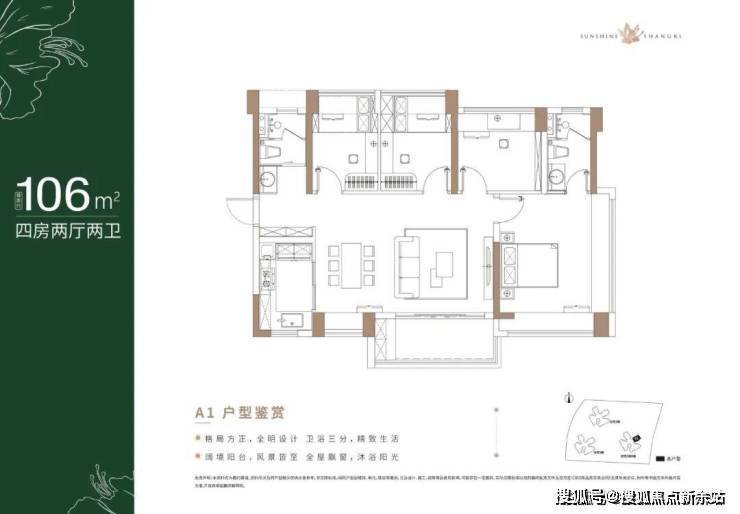 106㎡的4房2厅2卫,设计的是横厅南北通透格局,进门独立入户玄关,客餐厅6.1米开间,LDK一体化设计,4个卧室分别做到主卧17.31m²/次卧7.75m²/次卧7.41m²/次卧6.92m²(实测面积),主卧270°转角飘窗,U型厨房,公卫三段式分离,得房率:76.44%(不含赠送),阳台主朝西南或东南向。