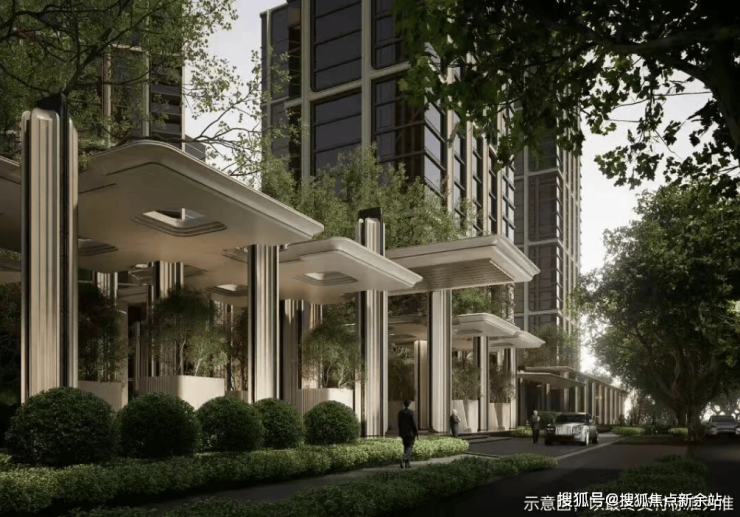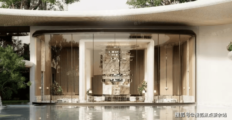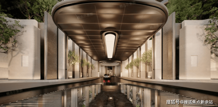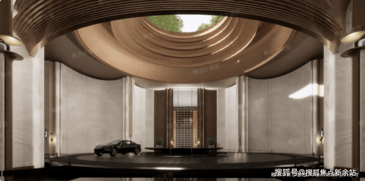 项目采用立体浮岛底盘设计,底部3层架空抬高,裙房布置万象系商业及社区配套,规划「地下落客-首层迎宾-上层漫游」三重立体归家礼序,约9米挑高车马厅搭配圆穹吊顶。