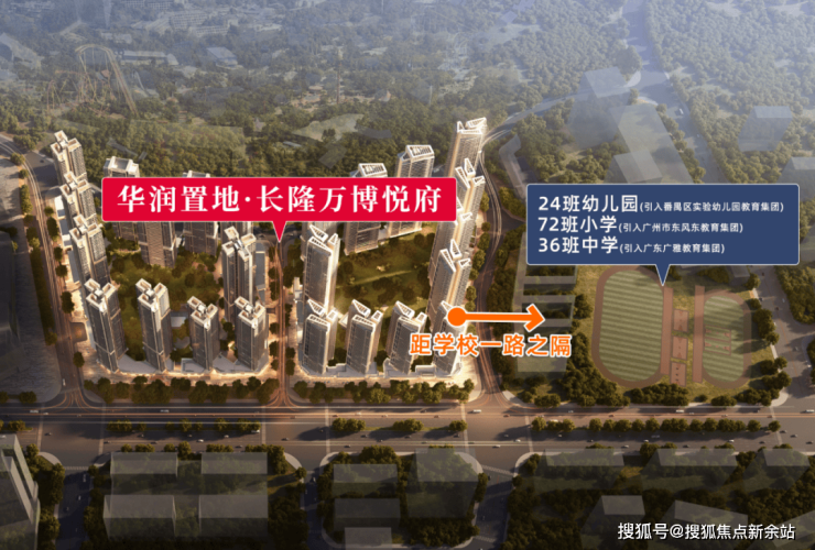 华润置地长隆万博悦府,住宅地块主要分为两期开发,目前一二期均在售,另外还包含了两块商业用地,其中一块配建万象商业,和中小学用地(配建21班幼儿园+72班小学+38班中学),是目前广州在售项目中,为数不多集学铁商的项目之一;