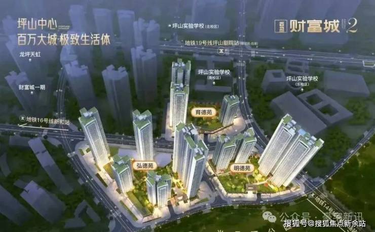 深圳财富城2期位于坪山区高铁新城金丰路与和安路交汇处西侧,地处坪山核心区域,是坪山区最顶流的居住区。该楼盘总占地面积约4.54万㎡,总建筑面积约35.8万㎡,共分为3个地块开发,分别为财富城弘德苑、财富城明德苑、财富城育德苑。
