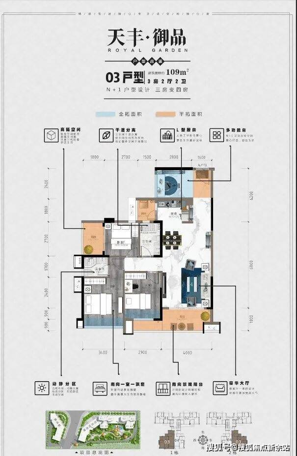 建面约109㎡ 4房2厅2卫:109m²可做舒适四房,带一个套间,双阳台双卫生间,纯南向景观阳台,主阳台可俯视园景,动静皆宜。