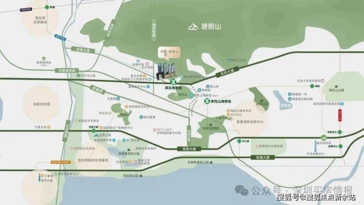 项目地址位于深圳市南山区桃源北环大道北侧塘朗山南麓,邻近深云地铁站。项目大体被山体包裹,西侧和南侧分别临近南坪快速路、北环大道两条城市快速路,其东侧还将建设侨城东路北沿线(建设中),所处片区相对割裂存在。