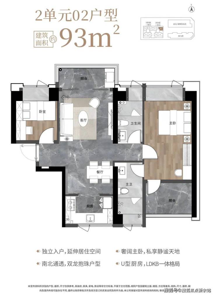 93㎡的3房2厅2卫,1栋2单元02户型,设计的是竖厅南北通透格局,独立入户,客厅3.6米开间,客餐厅分离设计,U型厨房,卫生间干湿分离,阳台正北朝向。