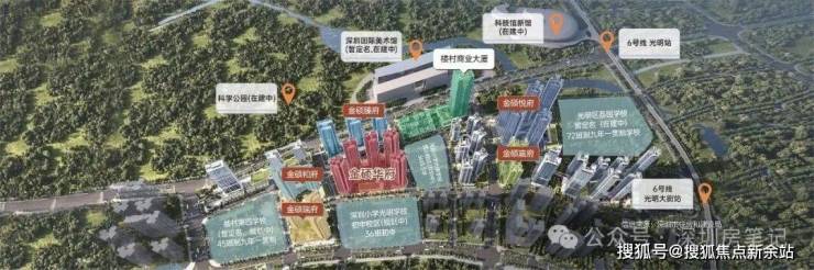 金硕臻府位于光明科学城"一心两区"的核芯承载区,也就是大家常说的中央居住区。项目北侧就是科学公园(南翼,在建中),向西约200米是在建的深圳外国语楼村第四学校,向南是光辉大道,地理位置相当核心。