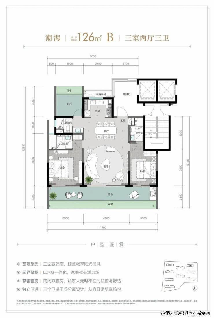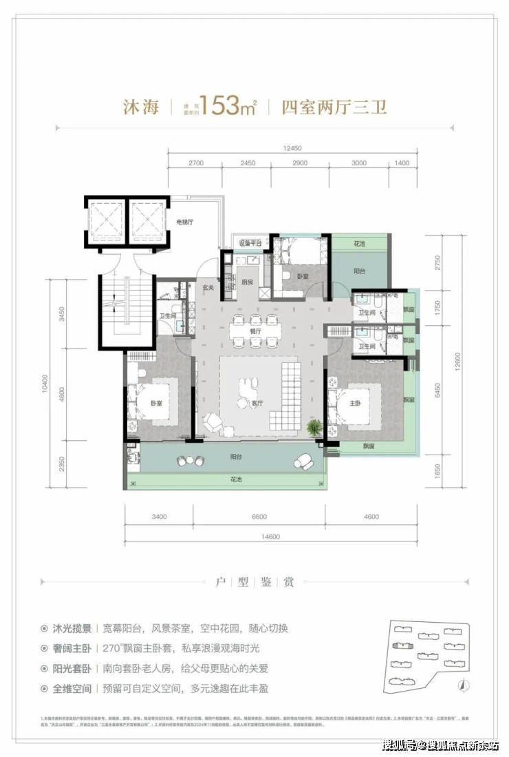 规划建筑面积约126-213㎡观海奢装大平层,约3.1米阔绰层高,部分户型创新设计270°全景飘窗主卧套、四开间朝南等,全成品高标奢装,营造全新舒居体验。