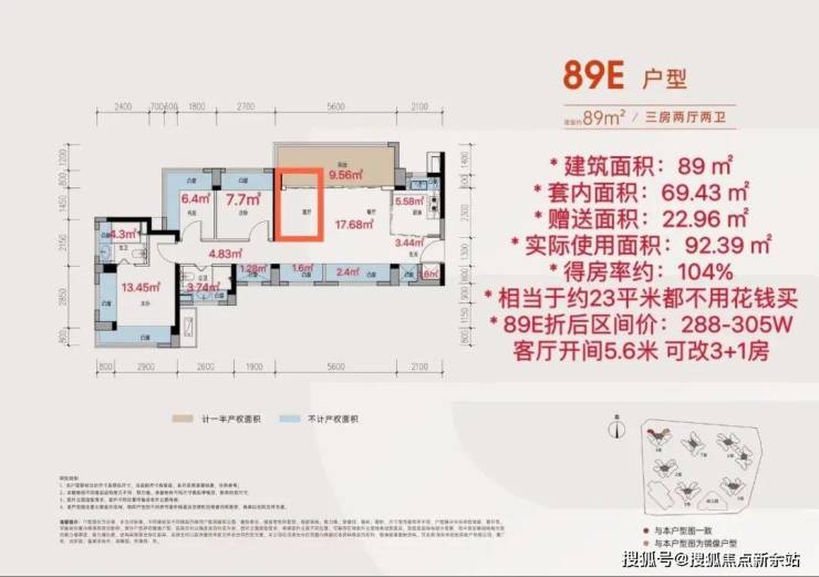 建筑面积:89㎡,套内面积:69.43㎡,赠送面积:22.96㎡,实际使用面积:92.39㎡,得房率约:104%,相当于约23㎡,都不用花钱买,客厅开间5.6米 可改3+1房。
