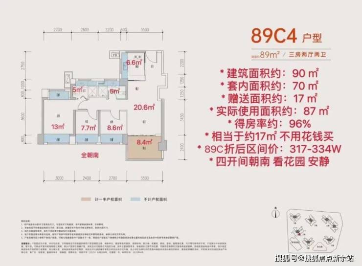 89A户型:3+1房,超100%使用率,南北通透,全飘窗高赠送!