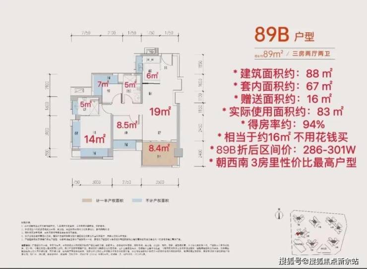 建筑面积约:89㎡,套内面积约:67㎡,赠送面积约:16㎡,实际使用面积约:83㎡,得房率约:94%,相当于约16㎡ 不用花钱买,朝西南 3房里性价比最高户型。