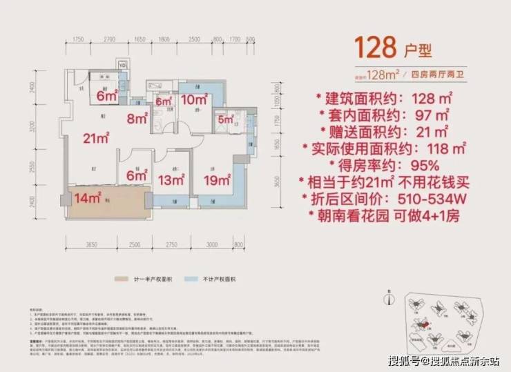 建筑面积约:128㎡,套内面积约:97㎡,赠送面积约:21㎡,实际使用面积约:118㎡,得房率约:95%,相当于约21㎡不用花钱买,朝南看花园。