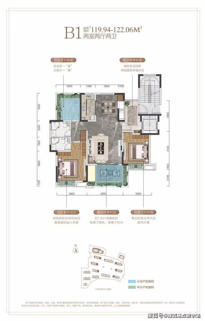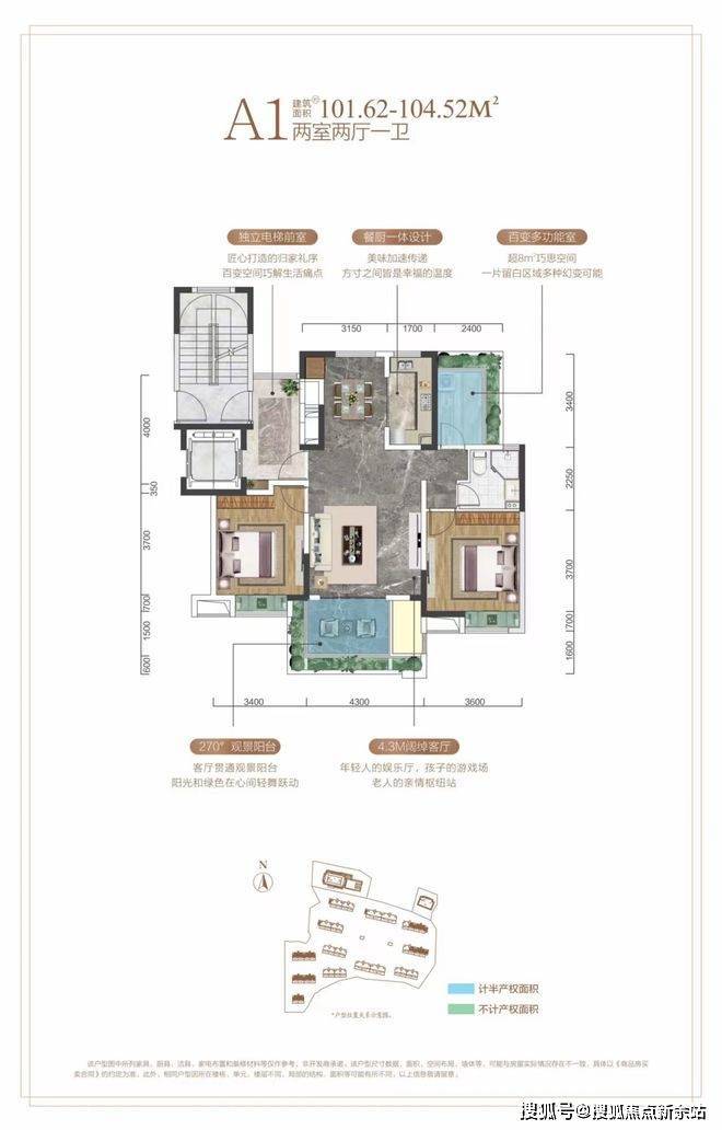 户型亮点:电梯入户送入户花园,得房率高达97%,客厅4.3米大开间,宽2.8米大阳台,阳台面积可达约14㎡,层高3.1米,南北通透通风好,次卧与主卧分隔开私密性好,明厨明卫