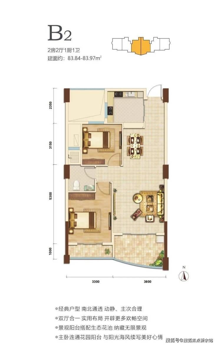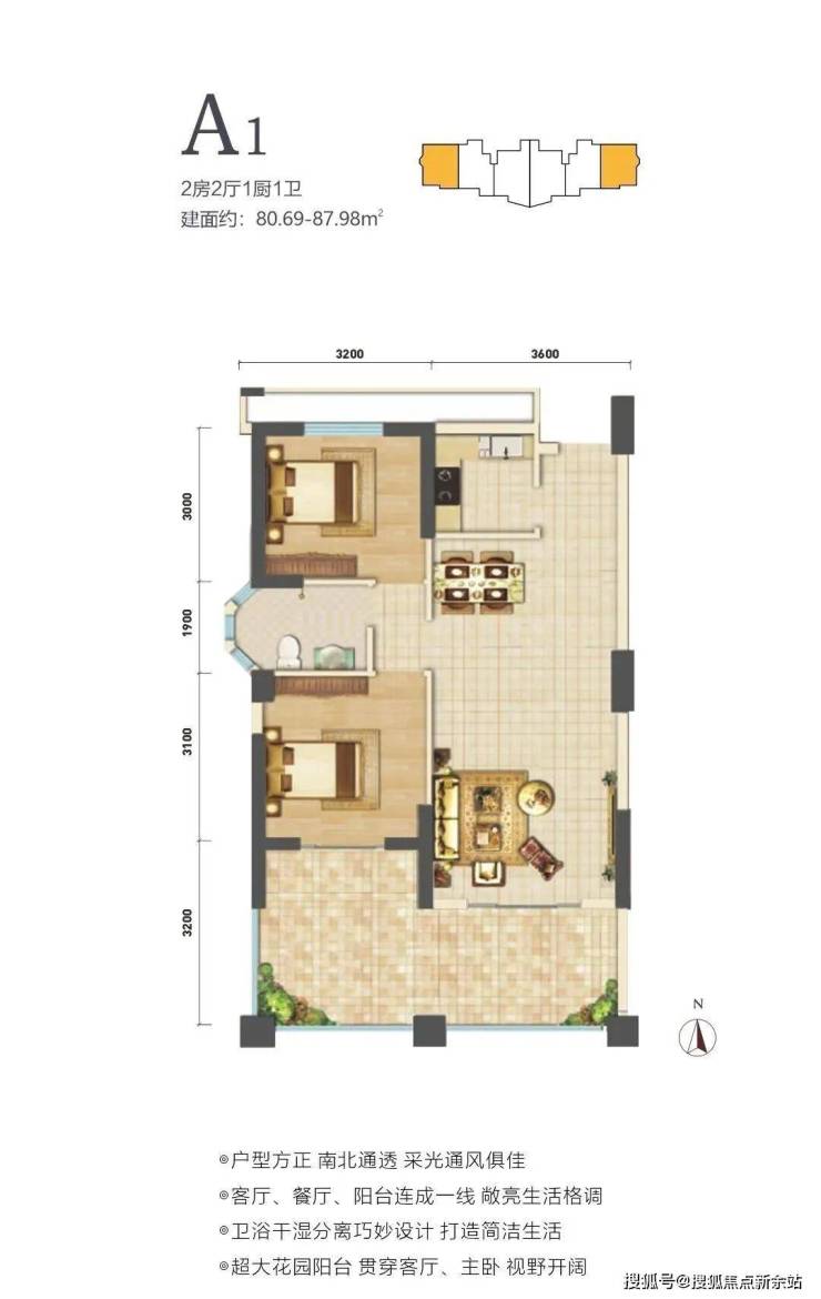 在售户型面积80-88㎡两房,户型方正,南北通透。