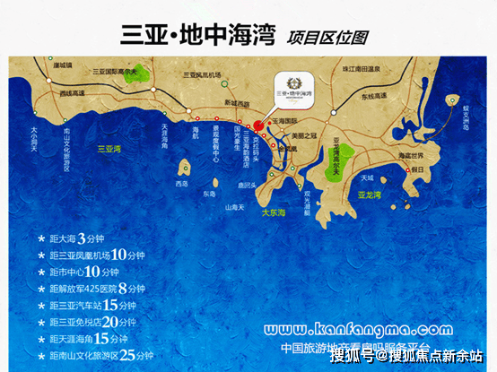 约30分钟内达“天下第一湾”亚龙湾,5A级景区南山寺,天涯海角,大小洞天,西岛等;