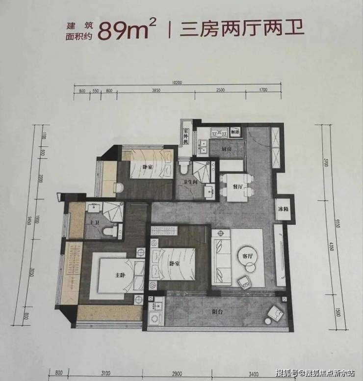 89㎡的3房2厅2卫,设计的是竖厅格局,客厅3.4米开间,LDKB一体化,S墙设计预留冰箱卡槽位,3个卧室分别做到了3.9米/2.9米/2.6米的宽度,客厅连接次卧出6.3米长的大阳台,L型厨房,卫生间干湿分离,有西北、西南或东南朝向。