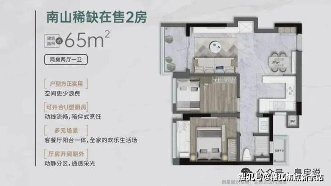 竖厅格局,客厅2.95米开间,LDKB一体化,S墙预留冰箱卡槽位,动静分区,U型厨房,卫生间三段式干湿分离还带1个设备平台,得房率约91%(包含赠送),实用面积约59.15㎡,正东、正西或正南朝向,得房率88%。