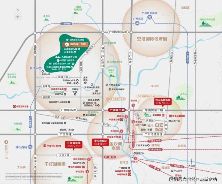 🚙交通优势:(1)三横三纵一城轨三横:广州绕城高速,广佛肇高速(接驳华快三期)、广三高速(接驳环城高速)三纵:许广高速、佛山一环、桂和路一轨:广佛轨道大工程-广佛环线西段(规划中) (2)通往白云20分钟、天河 40分钟项目沿中信大道上佛山一环可以快速接驳广佛肇高速,避开现有塞车段直达白云石井,去到滘心地铁站8号线,以及朝阳地铁站。转黄石路可达白云新城商圈、百信广场、白云万达一带,如果直接接驳华快更是可通达天河北商圈。 (3)通往白云机场 25分钟与空港经济圈和白云机场直线距离14km,沿佛山一环往北经广州绕城高速可达 (4)通往千灯湖30分钟、大沥 25分钟项目经佛山一环,或者桂和路往南行可通往大沥和千灯湖商圈。 (5)城际轨线 广佛环线西段规划在幸福大道的隧道位置设里水站,未来出行将更加便捷。 (6)公交总站 小区里开通了里05、222公交路线,还有直达金沙洲浔峰岗地铁站的接驳巴士。
