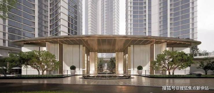 约9米高酒店式主入口,弧形雨棚+奢石立面