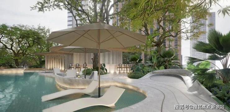 约500㎡度假风泳池,池畔吧台+躺椅区