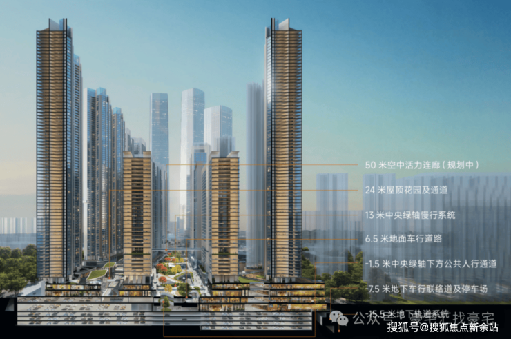 创新打造地上地下七重结构立体化交通系统,不同交通系统分层互联,人行系统、城市公共道路系统、地下轨交系统快速接驳,最大程度实现人车分流,科学化疏解交通压力。