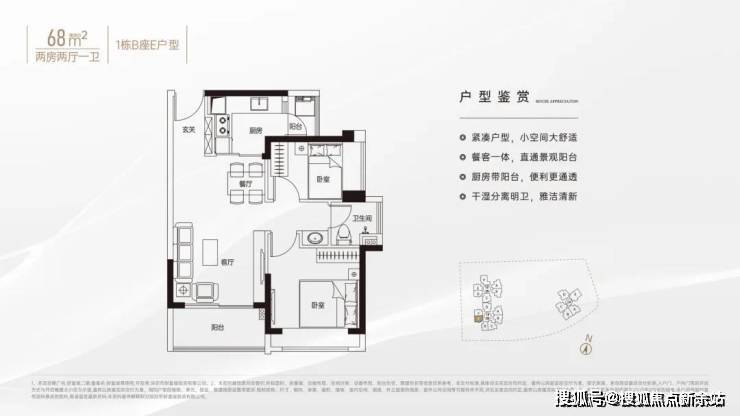 竖厅格局,客厅3.4米开间,LDKB一体化设计,动静分区,L型厨房还带1个生活阳台,卫生间三段式干湿分离,得房率约79%(不含赠送),东北朝向。
