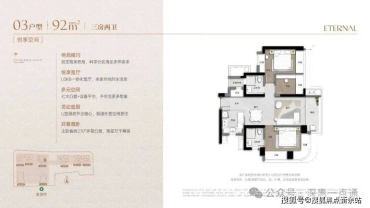 92m²的3房2厅2卫,设计的是双龙抱珠格局,客厅3.2米开间,LDKB一体化宽厅,主卧套房270°环幕凸窗,七大凸窗+设备平台,分别做到了主卧16.06㎡/次卧12.82㎡/次卧6㎡(实测面积,去掉墙体),U型厨房,卫生间干湿分离,得房率超90%(包含赠送),阳台实测6.54㎡正东朝向。