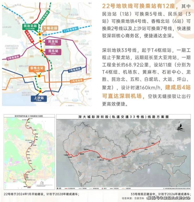 22号地铁线:总投资近400亿元,一期工程在2024年1月份正式开工,起自福田区上沙站,途径龙岗区,止至龙华区黎光站,预留向北延伸至东莞的条件,线路全长34.7公里,总设站21座,设计时速100公里,在未来将实现福田中心区与观澜组团中心45分钟通达的规划目标。