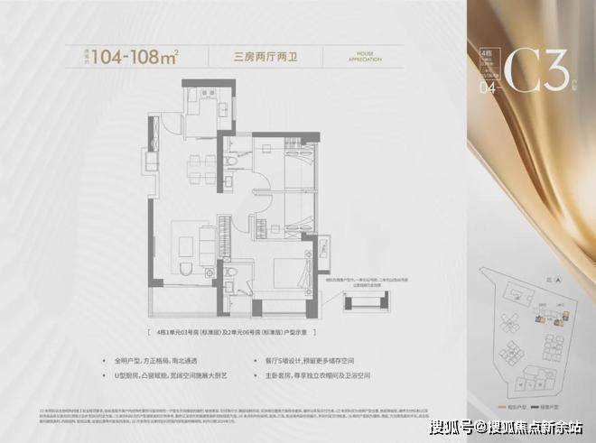 104-108㎡的4房2厅2卫,设计的是竖厅格局,进门入户玄关,客厅3.6米开间,LDKB一体化设计,进深8.7米,S墙设计预留冰箱卡槽位,三开间朝南,主卧套房设计,U型厨房,公卫三段式分离,得房率约72.45%(不含赠送),正南或正东朝向。