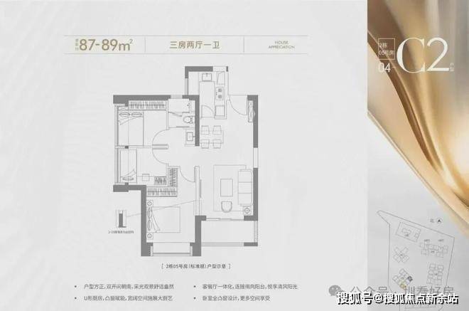 87-89㎡的3房2厅1卫,设计的是竖厅格局,进门入户玄关,客厅3.35米开间,LDKB一体化设计,进深7.2米,U型厨房,卫生间三段式分离,得房率约72.28%(不含赠送),西南或东南朝向。