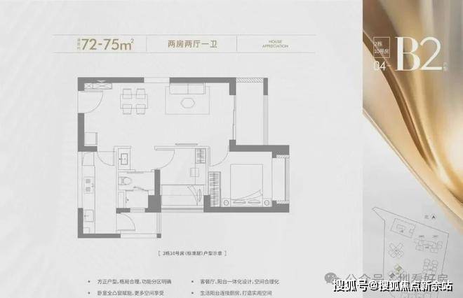 72-75㎡的2房2厅1卫,设计的是竖厅格局,客厅3.2米开间,LDKB一体化设计,进深7.2米,一字型厨房还带1个生活阳台,卫生间三段式分离,得房率约72.28%(不含赠送),西南、东南或东北朝向。